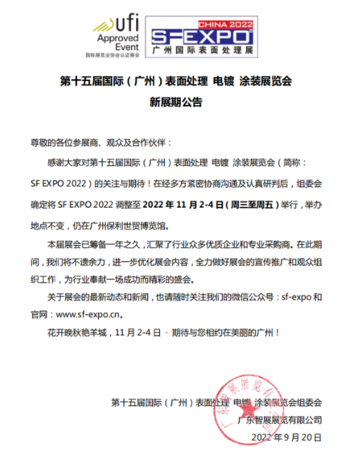 经过多方紧密协商沟通及认真研判后,组委会确定将第十五届国际(广州)表面处理 电镀 涂装展览会(简称:SF EXPO 2022)调整至2022年11月2-4日(周三至周五)举行,举办地点不变,仍在广州保利世贸博览馆。