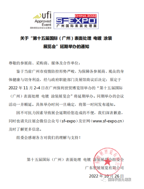 当前,鉴于全国疫情形势严峻,广东省内呈多点散发态势。为配合政府防疫工作需要,保障展商和群众的生命财产安全,确保展会能够顺利安全出展,组委会对档期进行了统一安排调整,本计划于2022年11月2-4日(周三-周五)举办“第十五届国际(广州)表面处理、电镀、涂装展览会”将再次延期举办,具体时间会另行通知。