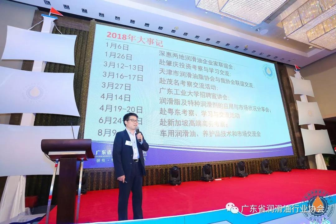 广东省润滑油行业协会 潘传艺秘书长作了《2018年协会工作回顾》演讲。在2018这一年里,我们协会已在广州、深圳、肇庆、茂名、珠海、东莞、上海、新加坡等地方举办了各种各样的精彩活动,涉及了产业园投资考察,润滑脂、特种润滑剂、金属加工液、车用油、添加剂等领域的技术分享会,还有企业家联谊交流会,人才招聘会、组团参展、团体标准编写培训、行业调研、走访央企等活动。不断地扩大协会的影响力,发展新会员的加入,使我们这个大家庭的成员越来越多。